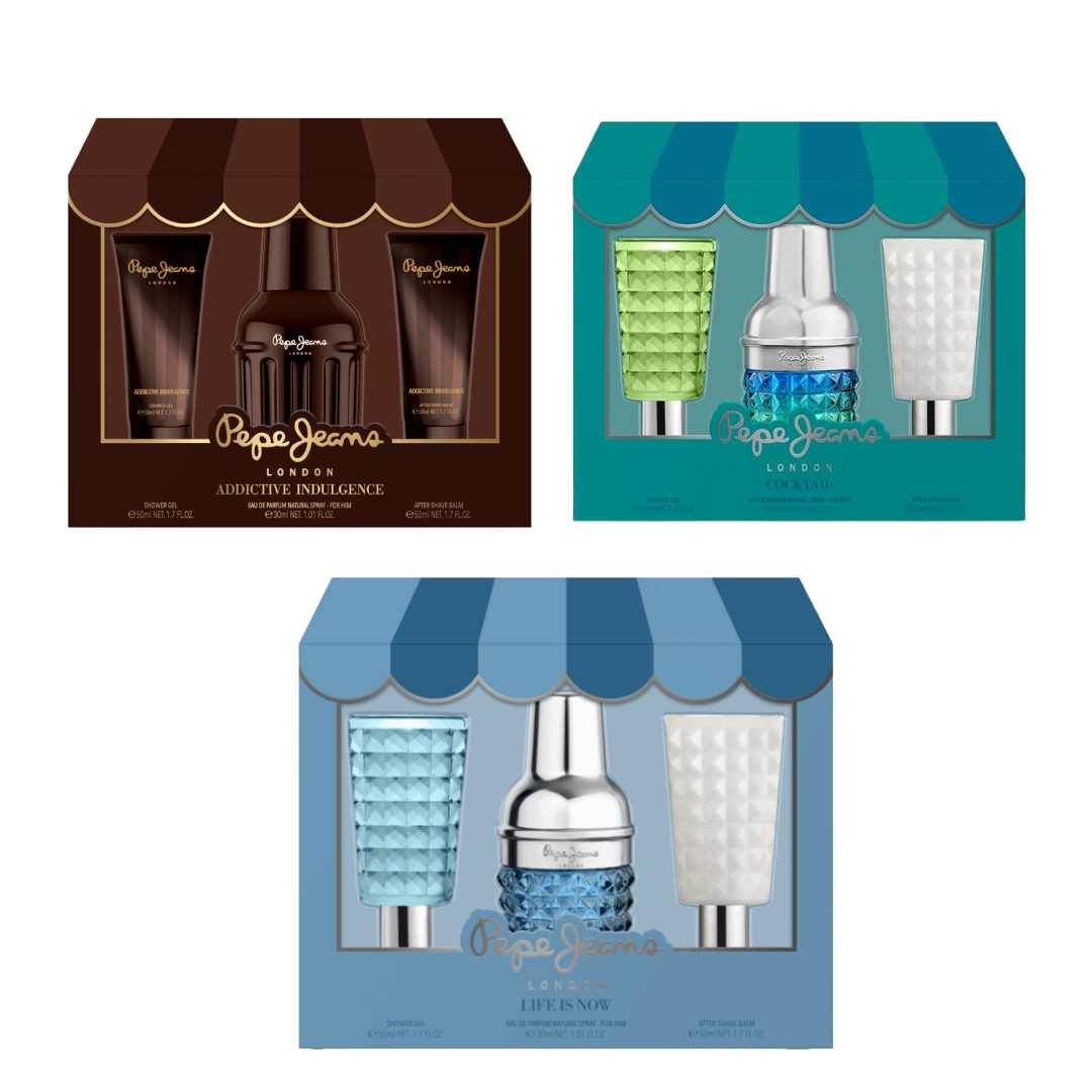 Discover the bold spirit of Pepe Jeans London through these deluxe fragrance gift sets—each one a curated trio of scent and skincare essentials, wrapped in vibrant, storefront-inspired packaging. Whether you're gifting someone special or treating yourself, these sets offer a complete sensory experience with signature style.